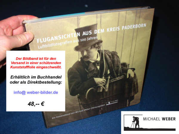 “Der vorliegende Bildband zeigt den Kreis Paderborn in Luftaufnahmen, die aus einem Zeitraum von 100 Jahren stammen. Das Buch ist das fünfte Werk von Autor und Herausgeber Michael Weber und das zweite in Folge, an dem ich mitgewirkt habe. Einem größeren Publikum in der Region ist Weber bekannt geworden durch sonst erdverbundene Themen, wie in seinen Fotobildbänden „Ansichten eines Kastanienbaumes”, „Ansichten der Altenau”, „Erinnerungen an den Krieg – Aus Etteln an der Altenau bei Paderborn” und „Hochwasser an der Altenau – Die Heinrichsflut von 1965”. In dem hier präsentierten Bildband nimmt er eine auch für ihn neue Perspektive in der – fotografischen – Betrachtung der Dinge ein und versucht, ihnen von oben auf den Grund zu gehen. Diese Vorgehensweise hat mir – als für dieses Buch tätigen wissenschaftlichen Berater – gleich zugesagt, da bei aller erforderlichen Bodenständigkeit in der Arbeit der aufwändige und daher seltene Blick von oben auch neue Erkenntnisse ermöglicht. Es heißt: „Ein Bild sagt mehr als tausend Worte”. Das gilt natürlich auch für die Luftbildfotografie, doch die Voraussetzung dafür ist eine erkennbare Bildaussage. Die meisten der hier zu sehenden Fotografien zeigen die Landschaften und die rund 80 Dörfer und Städte im Kreis Paderborn und können für sich alleine auf den Betrachter wirken. Bei einigen anderen Luftbildern, insbesondere den historischen Schwarzweiß-Aufnahmen, stellt sich jedoch schnell die Frage, ob diese ohne Erläuterungen verstanden werden können. Daher wurden insgesamt 16 Autoren aus der Region gebeten, zu ausgewählten historischen Luftbildern aus dem Zweiten Weltkrieg Begleittexte zu verfassen – und alle haben sich in spannenden und aufschlussreichen Beiträgen ihre eigenen speziellen Gedanken dazu gemacht. Die kurzen kompakten Textbeiträge sollen zum Einen Beschreibungen der sonst nur Fachleuten bekannten und selten gezeigten Fotografien darstellen und zum Andern ermutigen, sich selber ausführlicher mit den abgebildeten Zuständen und Ereignissen zu beschäftigen. In diesem Sinne wünsche ich allen Lesern eine spannende Lektüre und viel Freude beim Betrachten der Bilder. “ Norbert Ellermann