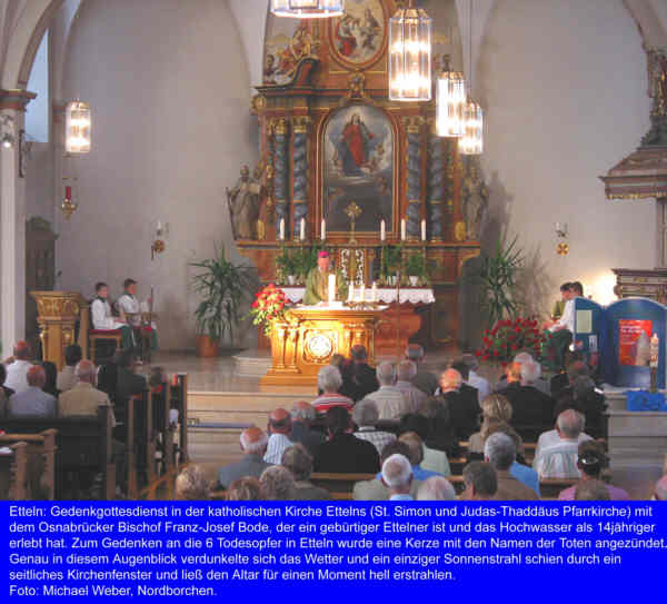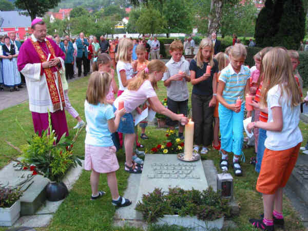 Bischof Bode Osnabrück mit Kindern am Grab der 4 in 1965 ertrunkenen Kinder Gedenkfeier zum 40. Jahrestag des Hochwassers 1965 am 17. Juni 2005 Das Buch war Anlaß, sich daran zu erinnern und die Gedenkfeier zu organisieren