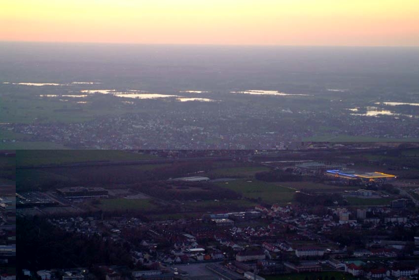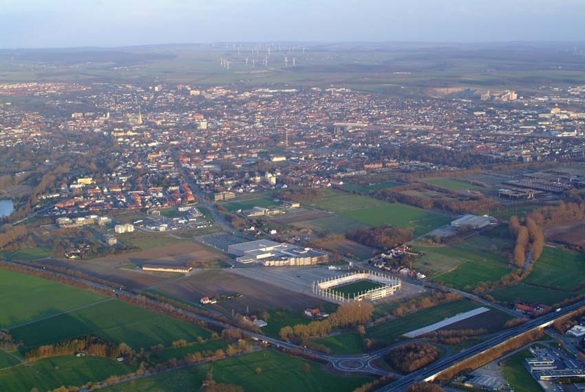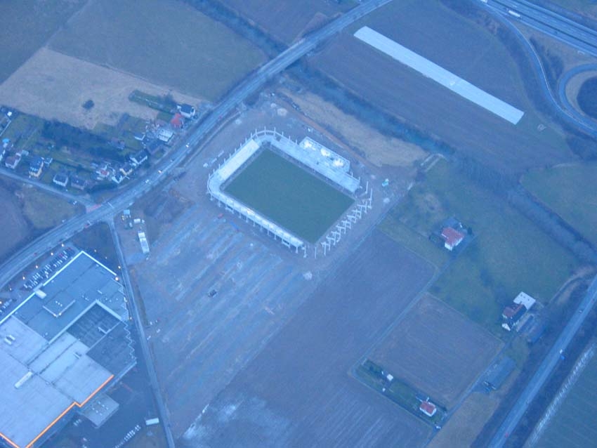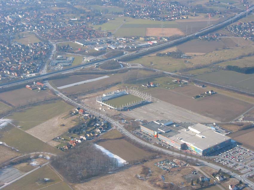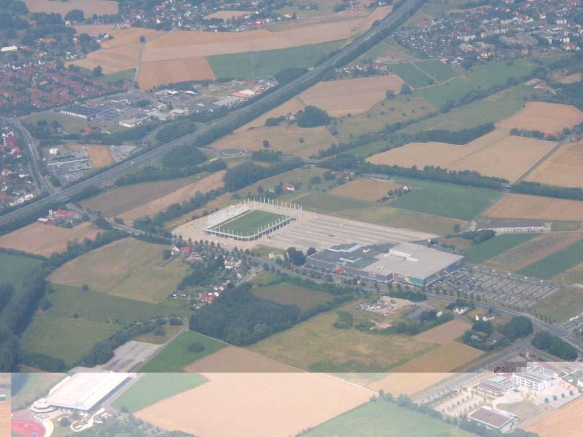 Die nachfolgenden 6 Bilder zeigen die Baustelle des Fussballstadions „Paragon-Arena“ in der Zeit bis vor dem Sommer 2007. Am Abend ist das benachbarte Möbelhaus Finke beleuchtet und aus der Ferne gut zu erkennen. Im Hintergrund glänzen die Lippeseen im Abendlicht der untergehenden Sonne.